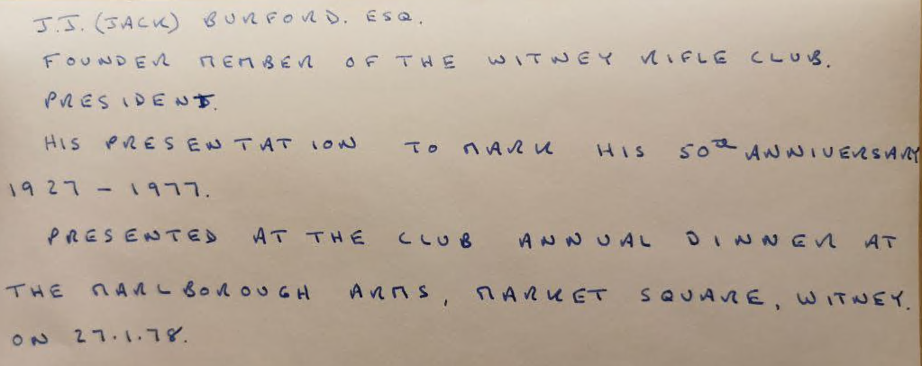 Trevor Bounds has been looking through an archive of paperwork and some interesting material has been found.  An old photograph of founding member Jack Burford has been found where he is presented with a plaque to mark his 50th anniversary at the club with the date range 1927 - 1977.  This would suggest the club was founded in 1927, though it is not clear at the moment if this was the time the clubs name was changed from "Witney British Legion Miniature Rifle Club" to "Witney Rifle Club".  It would be nice to know when the name changed.